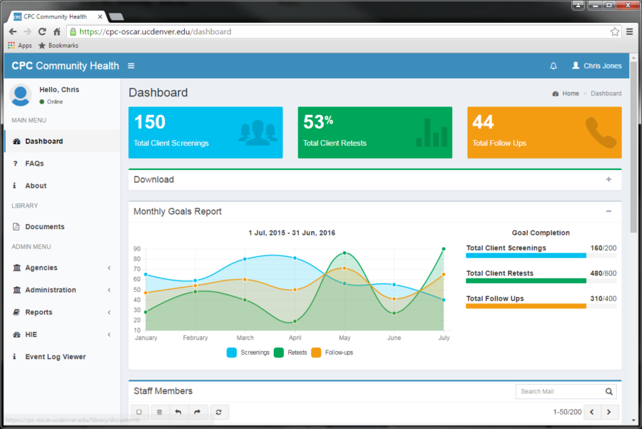 OSCAR’s administrative web portal revolutionizes management of staff, resources, and reporting statewide. The portal monitors and supports productivity, generates community reports, and catalogs medical, lifestyle, and social resources for each community.